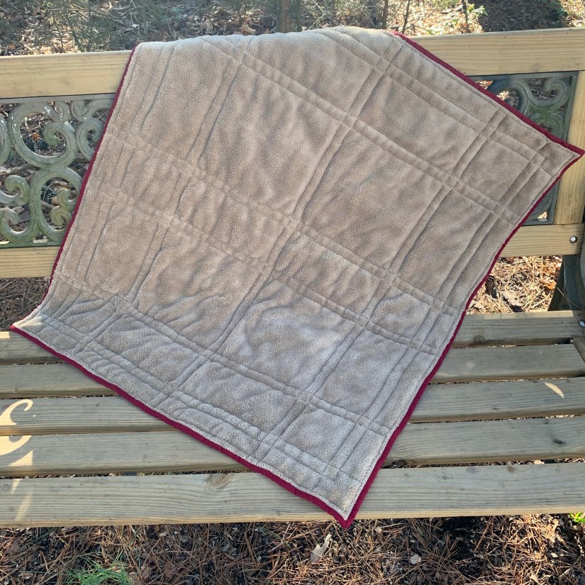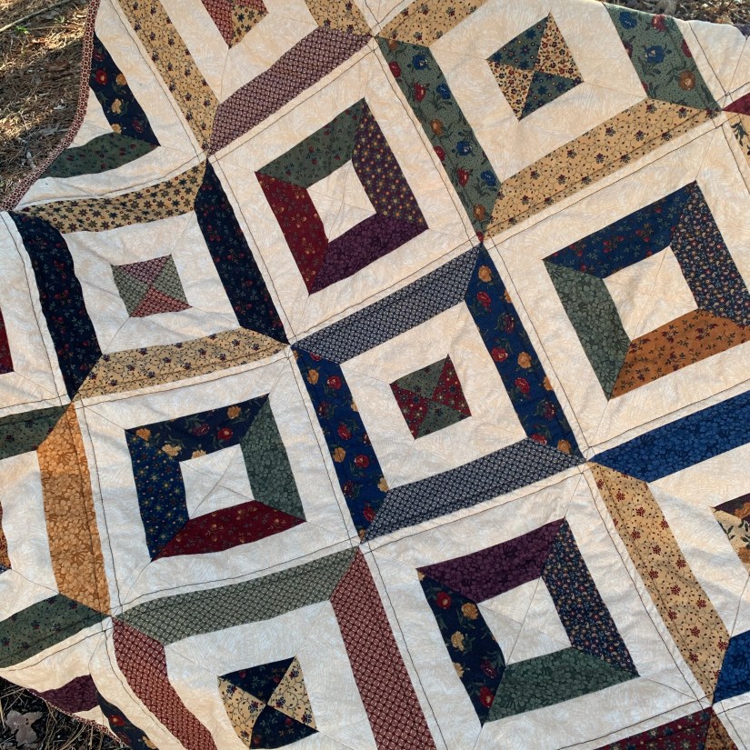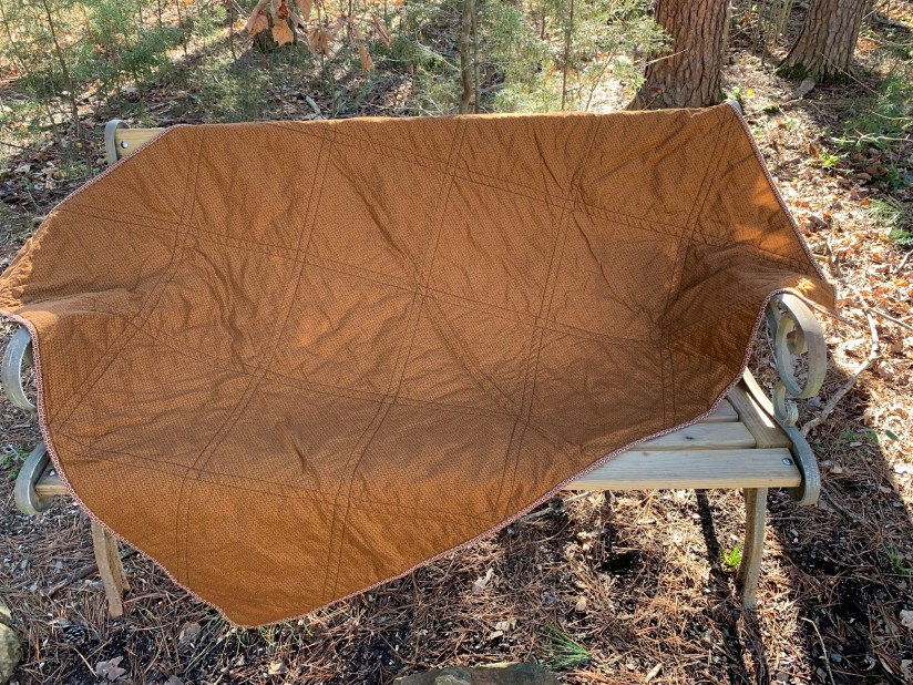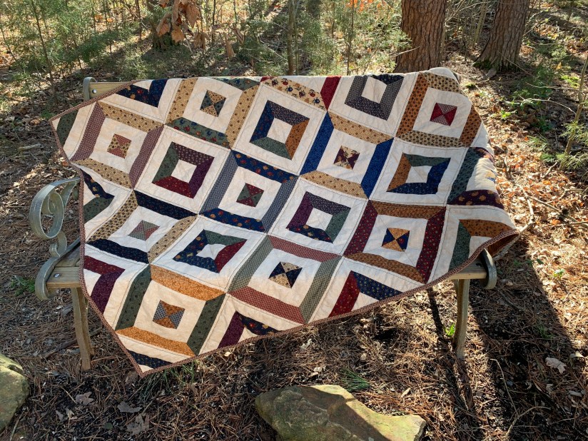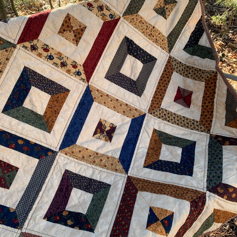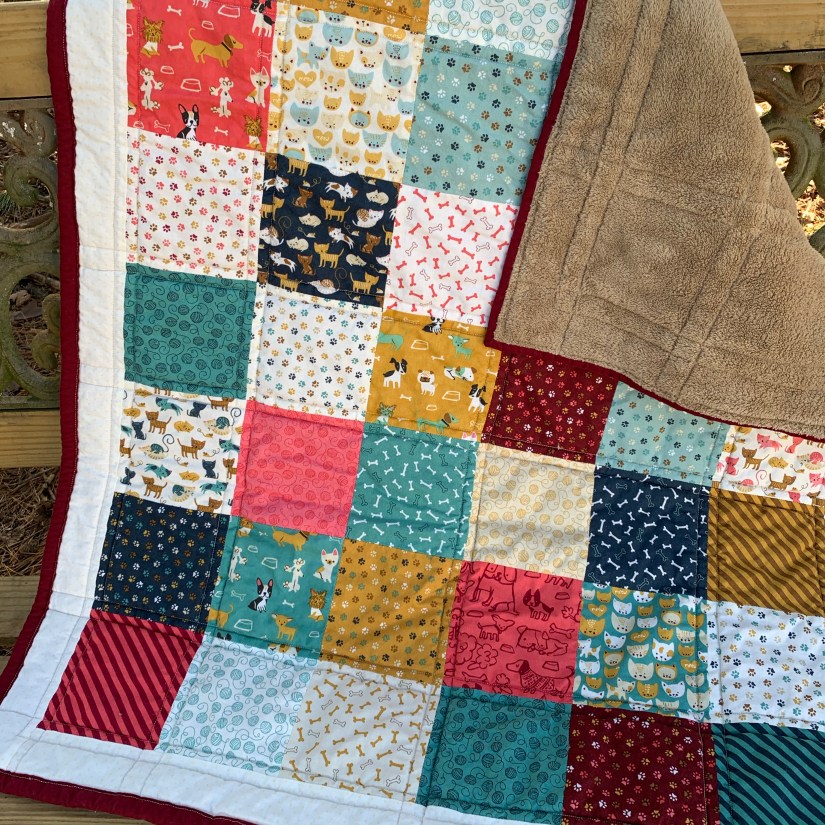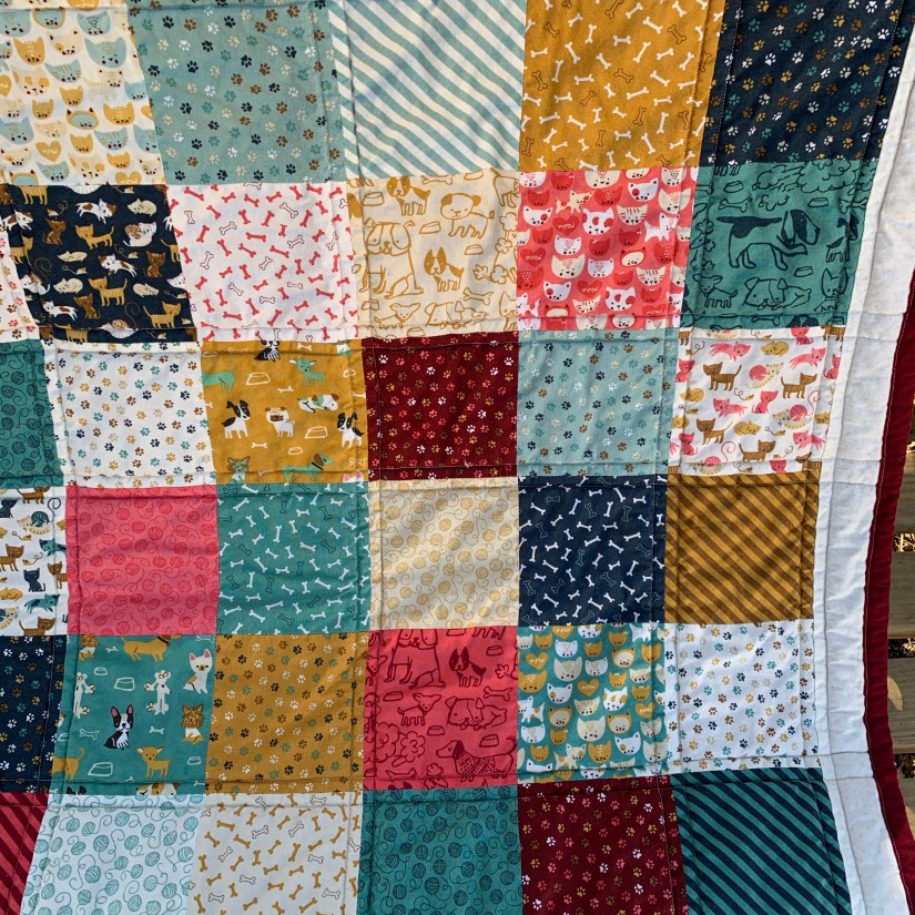 Finally, my strip quilt. This was one that has been in the works for quite a while. I have been trying to finish up some or all of my WIPs, and this one looked like a good one to start with. I used a variety of fat quarters to make the strips. It has been so long that I do not remember the fabric line I used… a few years will do that I suppose. I backed it with a large piece of tone on tone brown that I had and even found a matching fabric that I cut into 2.5″ strips for the binding! I was so proud of myself for using items from my stash that have been so patiently waiting for attention 🙂