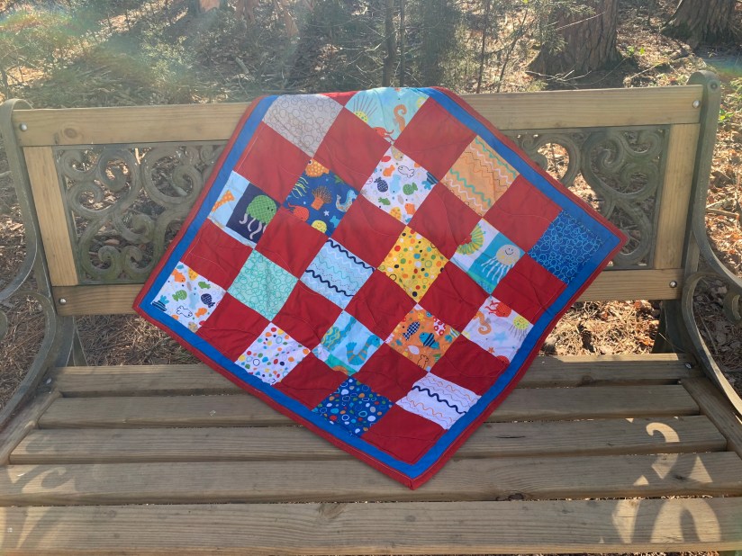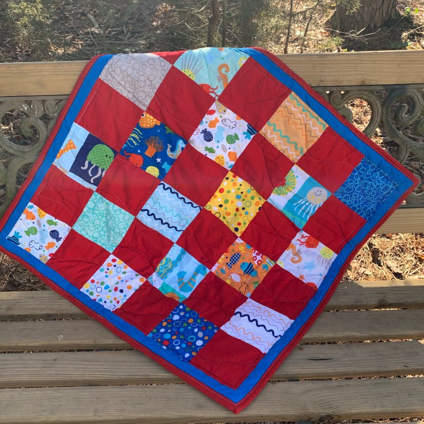This is a small baby quilt. The charm pack is Riley Blake’s In the Ocean and came with only 18 blocks. I added Moda’s Bella Solid Red blocks to help it grow 😉 Using blue honey bun strips for border and Red strips for binding. It is backed with white flannel. The prints are so fun and flowy, that I continued that feel by using my walking foot and quilted waves.