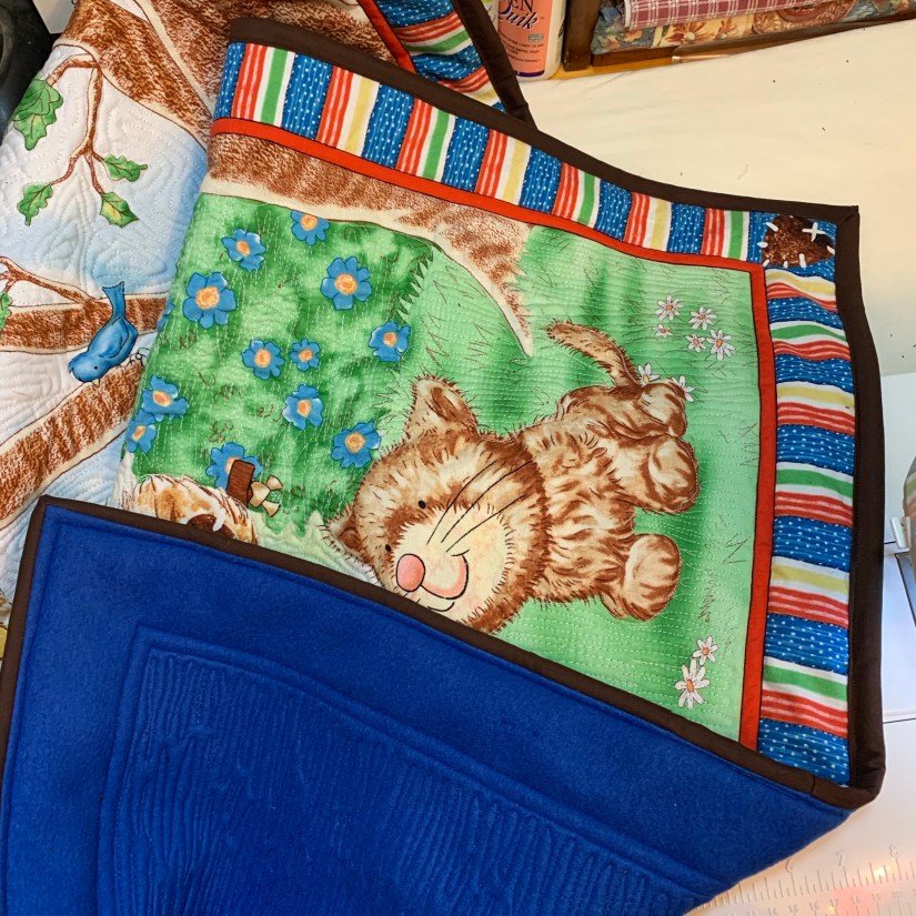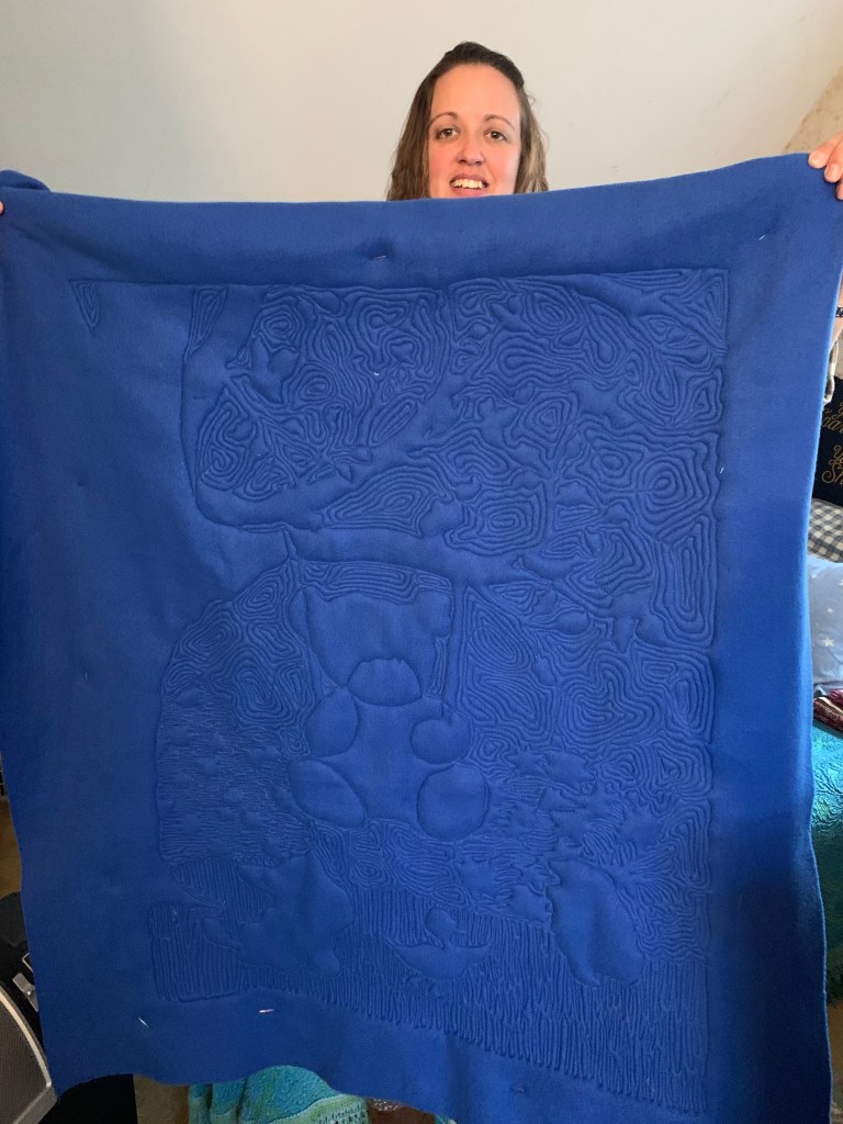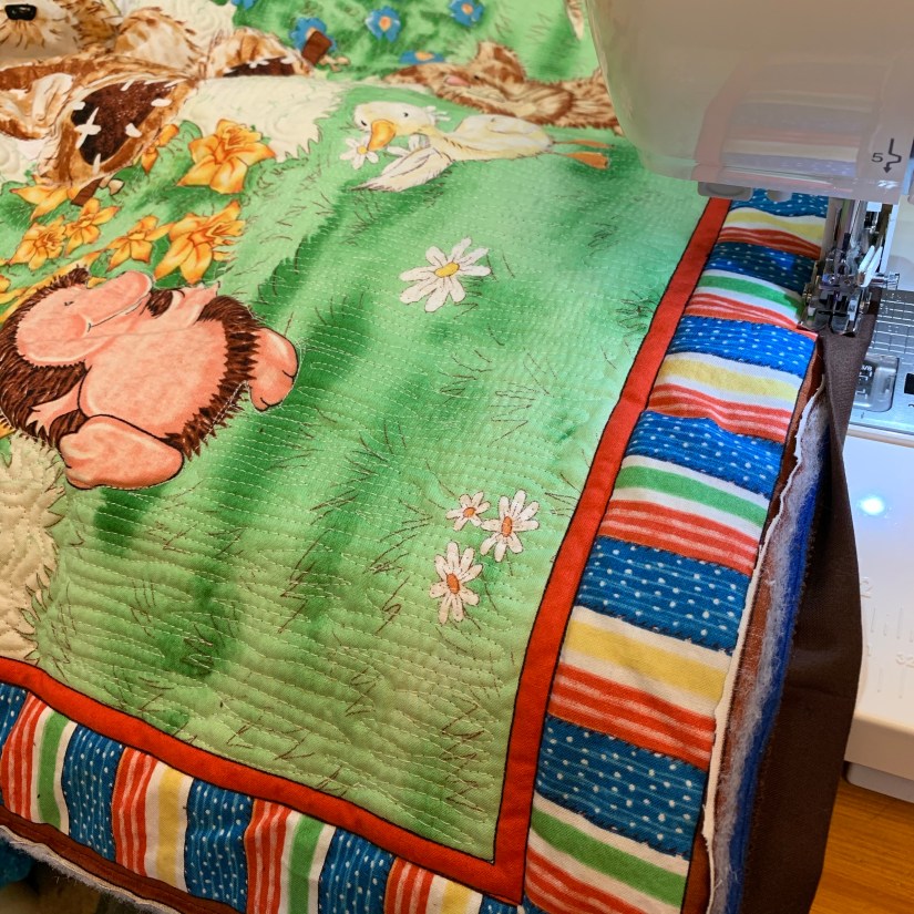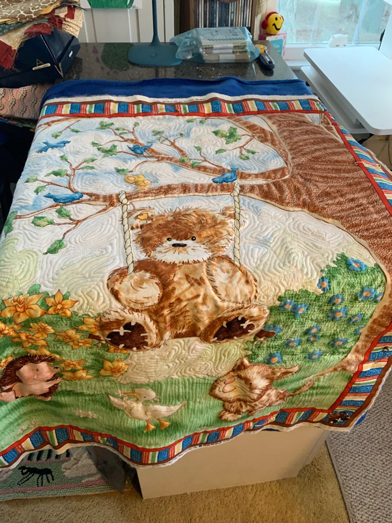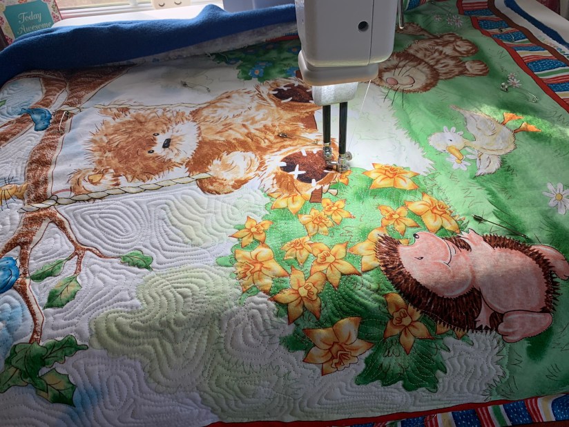 I guess you could say that I am a very “dense” quilter LOL! Meaning my quilting is very dense or closely quilted. Which made this quilt turn out really neat because all the little animals and tree pop and are puffy! You can see that in the photo on the right just above.