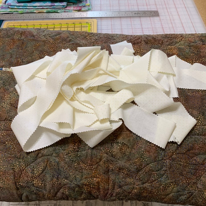 This past weekend I told myself that if I want to use this quilt, I need to finish it. So I pulled out a cream dot jelly roll by Riley Blake and began preparing my binding.