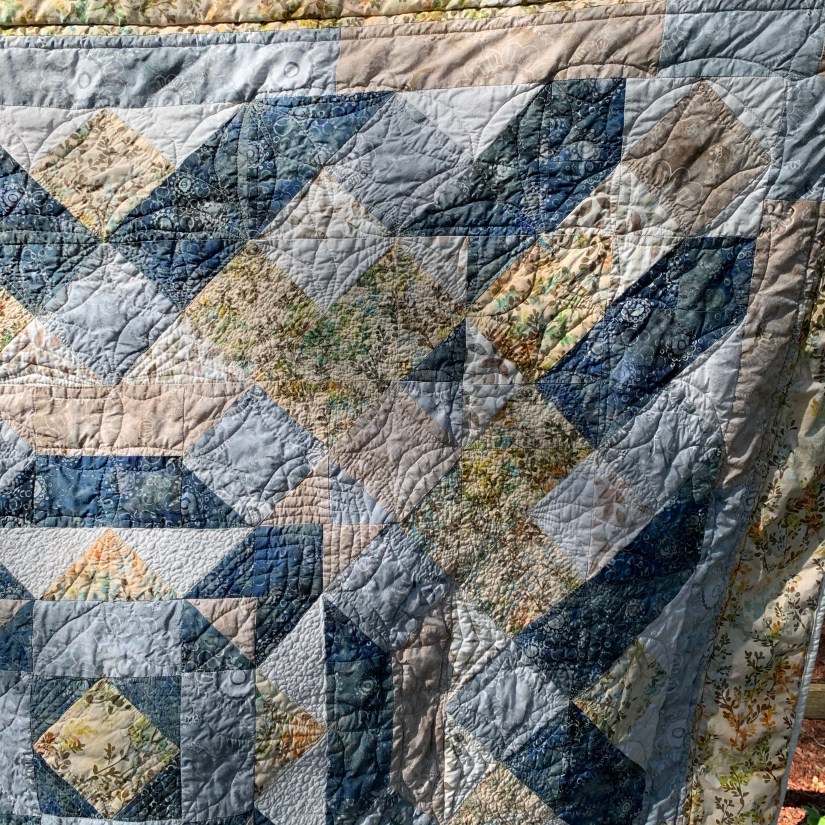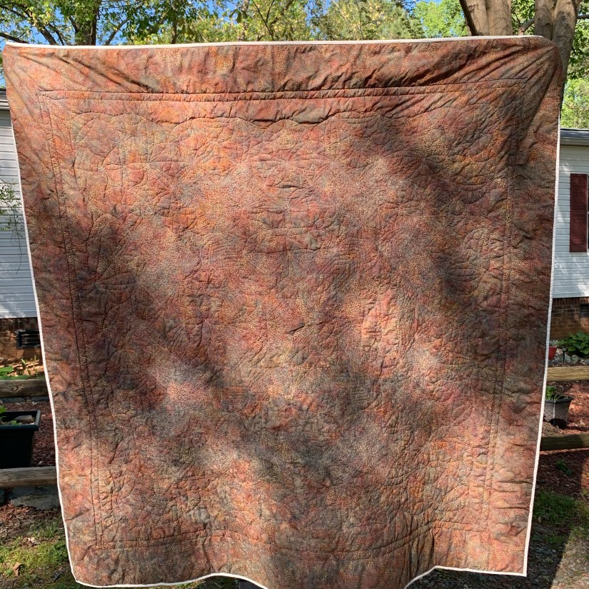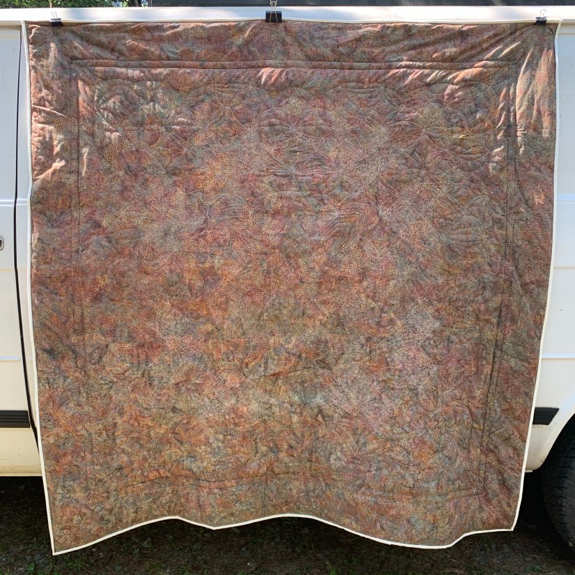 All fabric used in this quilt, not counting the binding, was batik fabrics. I did prewash the backing… twice. Only because while I was ironing the backing, I spilled some water on it when I was filling my iron. The backing bled brown all over my ironing board cover Knowing that, I was a bit anxious about bleed when it was time to wash this quilt, so I added 3 color catchers (which were pretty brown after wash) to help ease my mind.