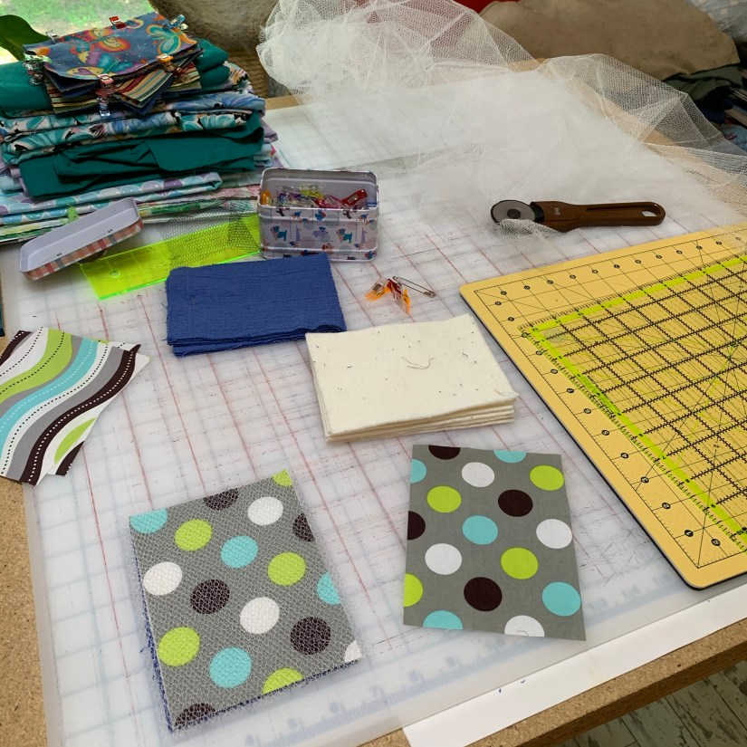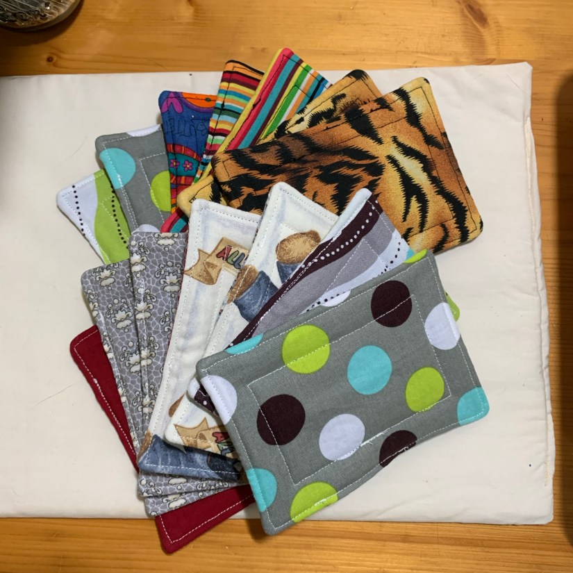 I cut my fabric and batting 4.5″ wide by 6″ tall. I added tulle to one side of some of the unsponges, and figured out that I had to cut those 2 pieces approximately 5″ by 6.5″ so there is plenty to catch when sandwiching. The tulle gives your unsponge a “scrubby” side. On some of the unsponges, I used an old course rag just to test out (that is the blue stack above).