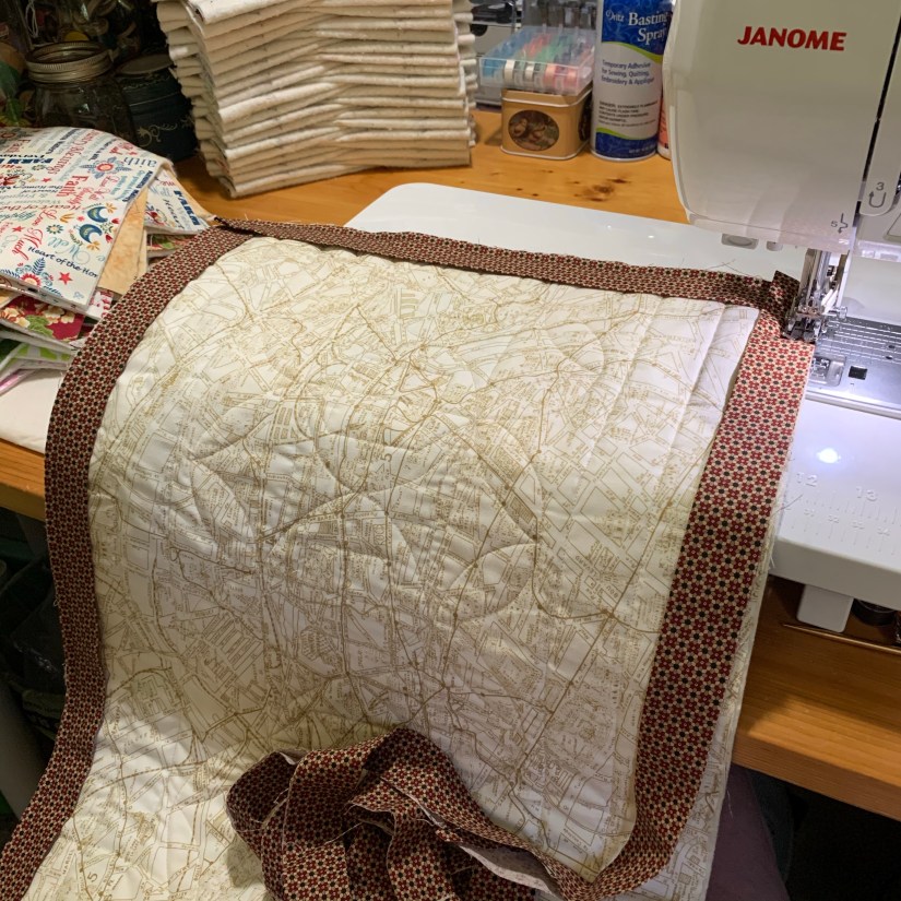 The 3 photos above show the back and my binding process. You can kindof see the quilting, but the fun Paris Streets fabric blends it in.