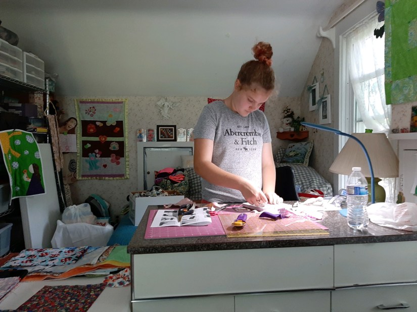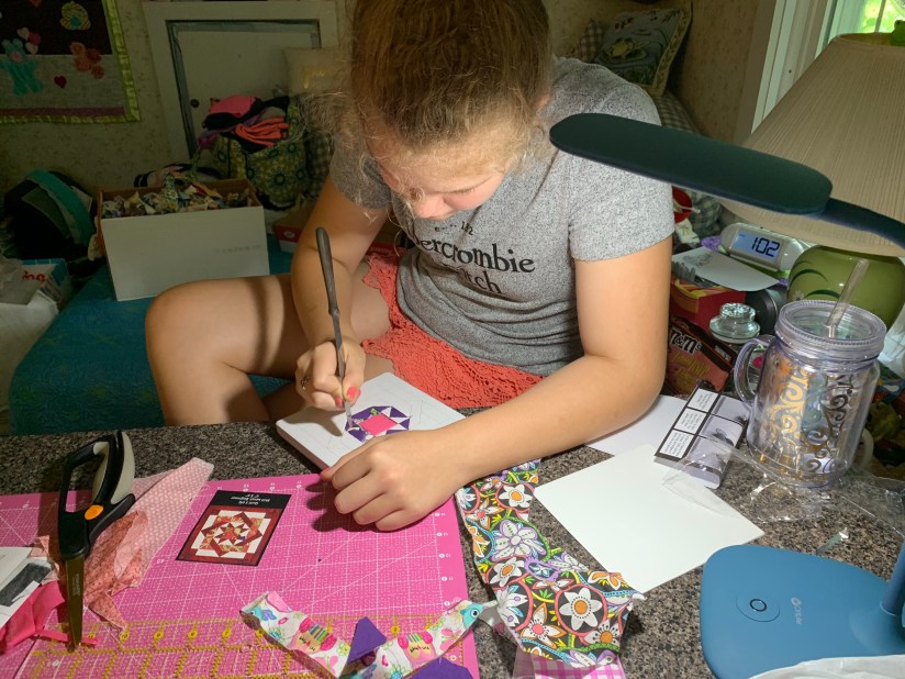 After digging out and gathering enough different fabric scraps, she began figuring out how she was going to create her quilt.