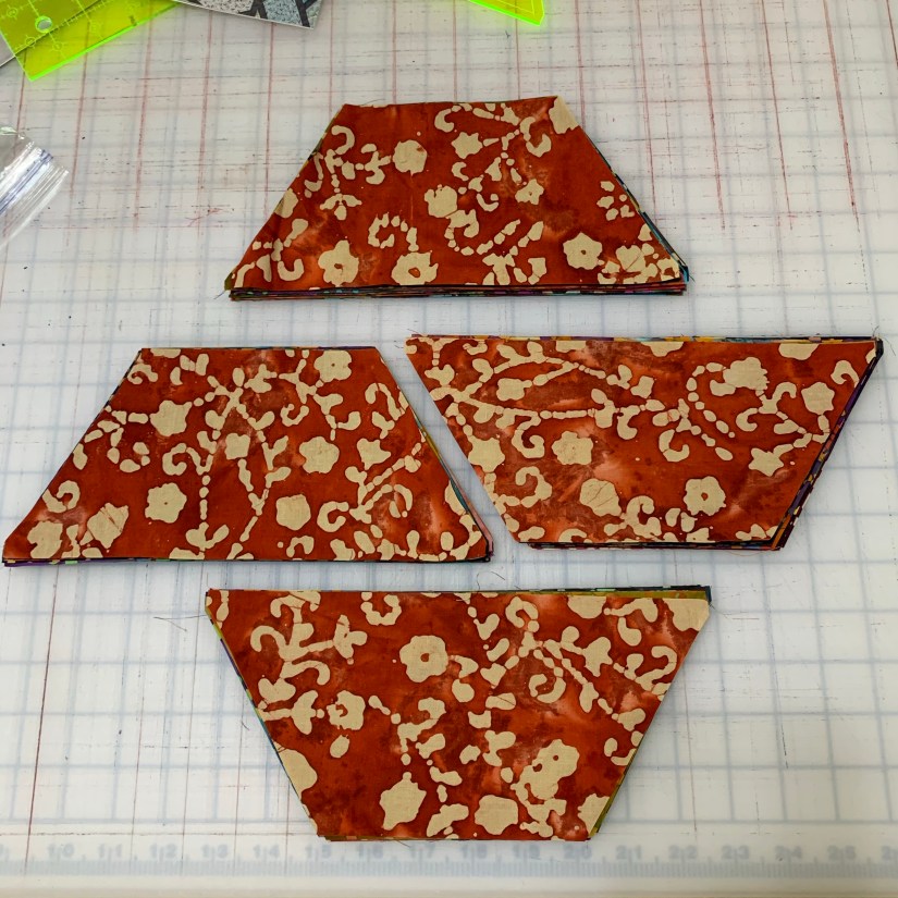 The layer cake has 2 of each fabric, so I got 4 large half-hexagons of each. In an attempt to keep them blocks as scrappy as I could, I made 4 hexi stacks.
