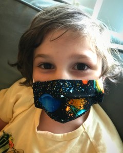 Though, the one on the right is sporting his sister’s mask because he had forgotten his own.