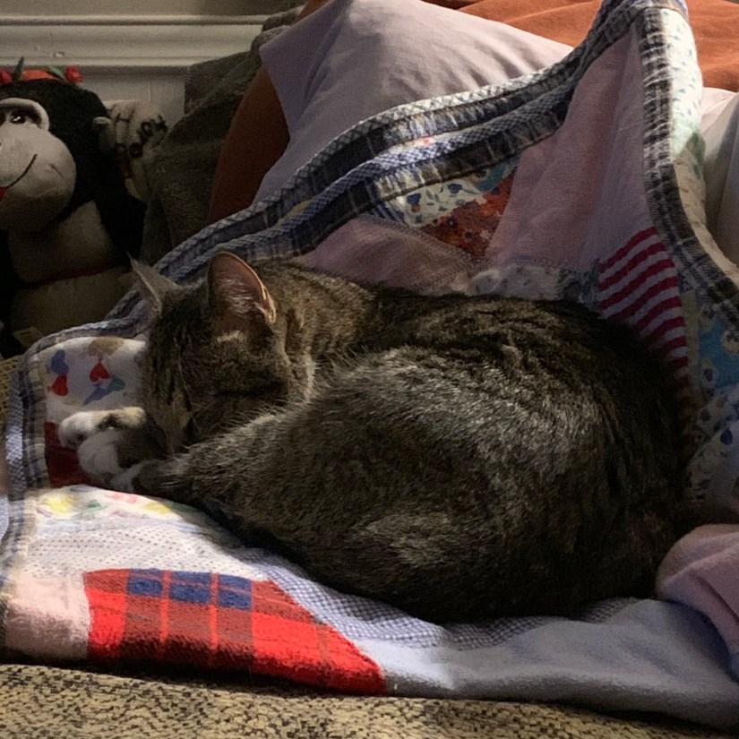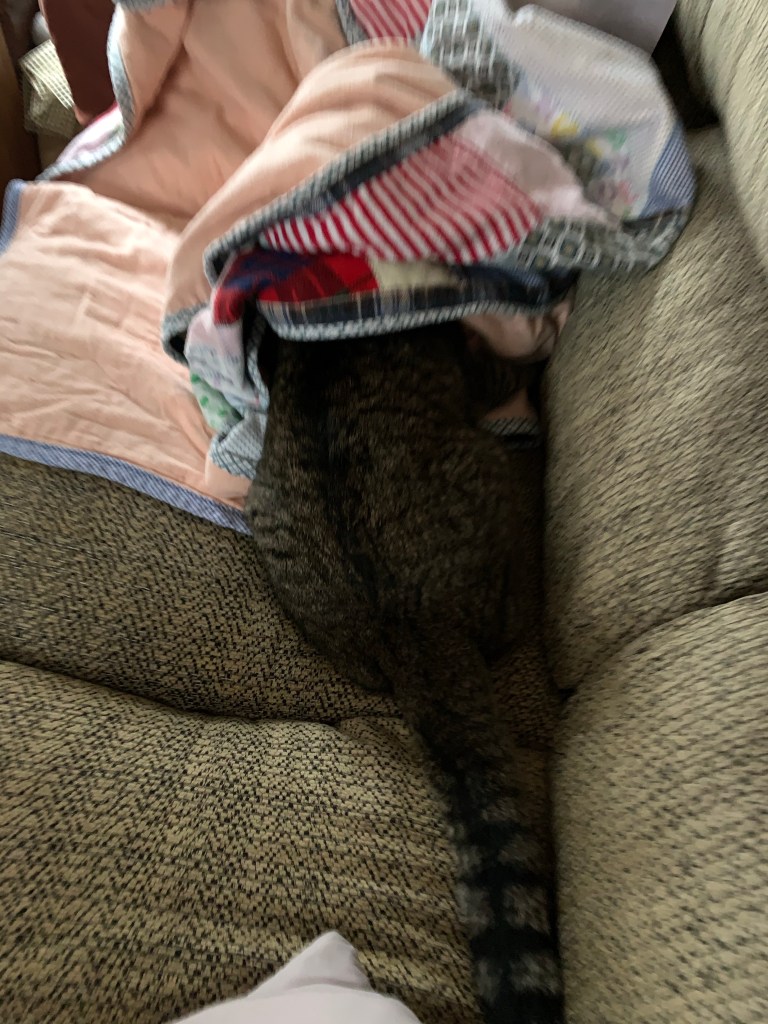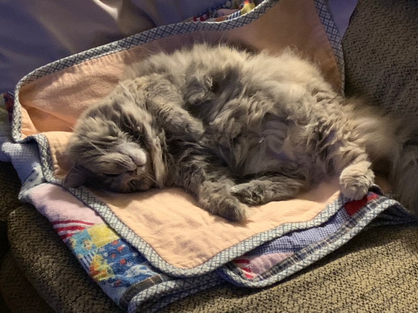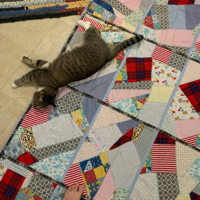 I have to say, the kitties are really good at only using and claiming quilts in the living room or bedroom. They know not to bother me when I’m in the sewing room ironing or quilting. (They think I’ll sew their tails up, hehehe)