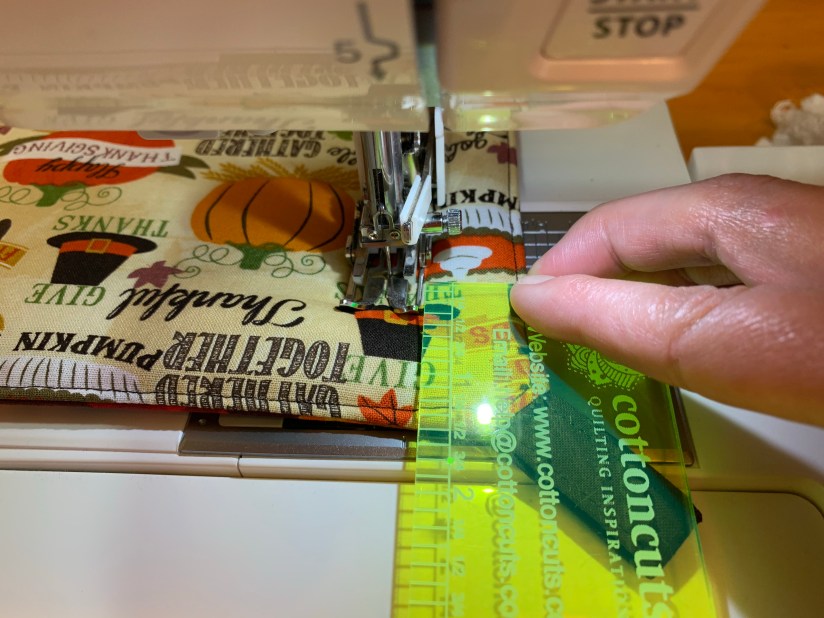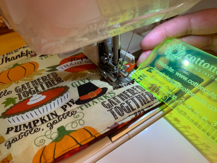 One evening, while making potholders, it occurred to me that this teeny tiny template was just what I needed to help make my inner squares even! By measuring from the edge of the potholder to where I put my needle down, helped me to stop at the corners at just the right spot. Genius, right?! Let me show you…