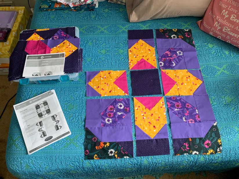 Ok, so if you have read many of my blog posts, you know that I love the Cotton Cuts Puzzle Mystery Quilt (PMQ) BOMs. Well, last spring I gifted my mom a PMQ. I chose a fun bright colorway (that I knew she wouldn’t have chosen), and didn’t tell her – I knew she would love it though, and get as addicted to them as I am… hehehe!