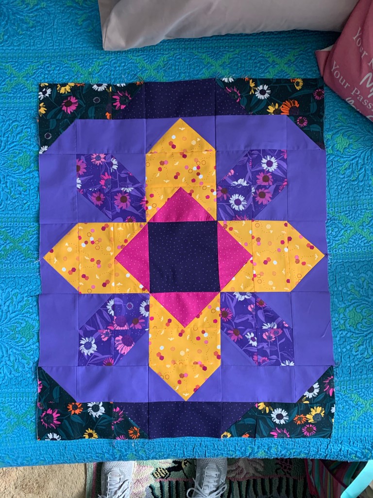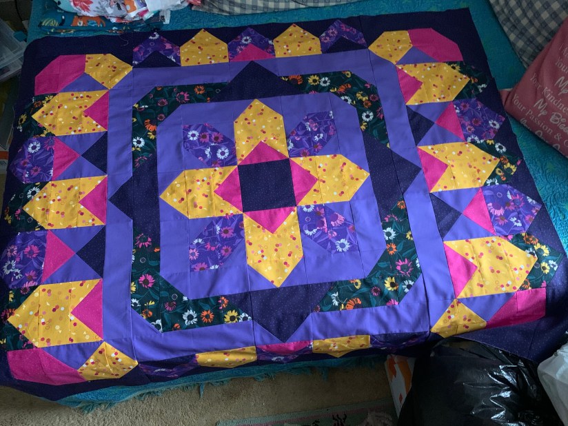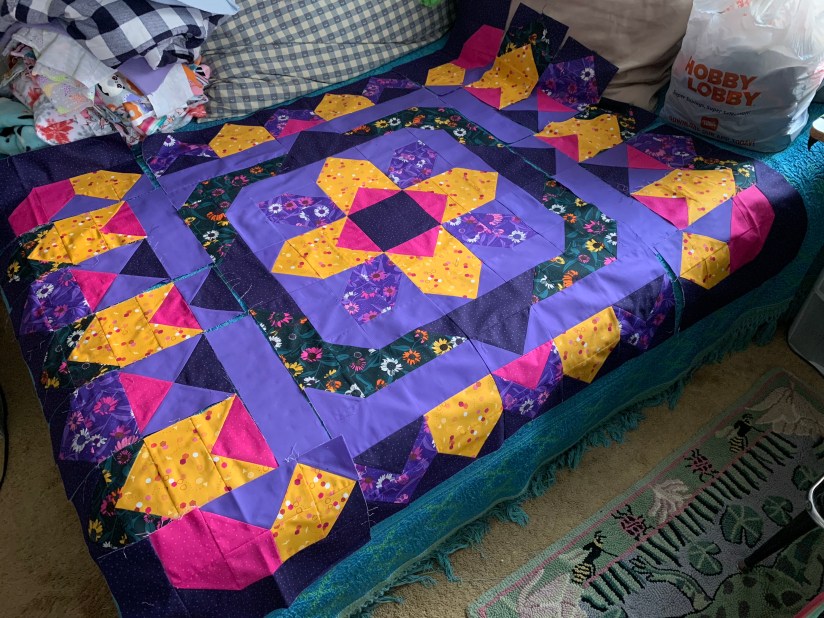 Even though she was unsure about the swatches in the beginning, she has now fell in love with them! This quilt is so bright and fun, too! Mom has since gotten this lovely top ready to quilt, but hasn’t quite decided on how to quilt it yet.