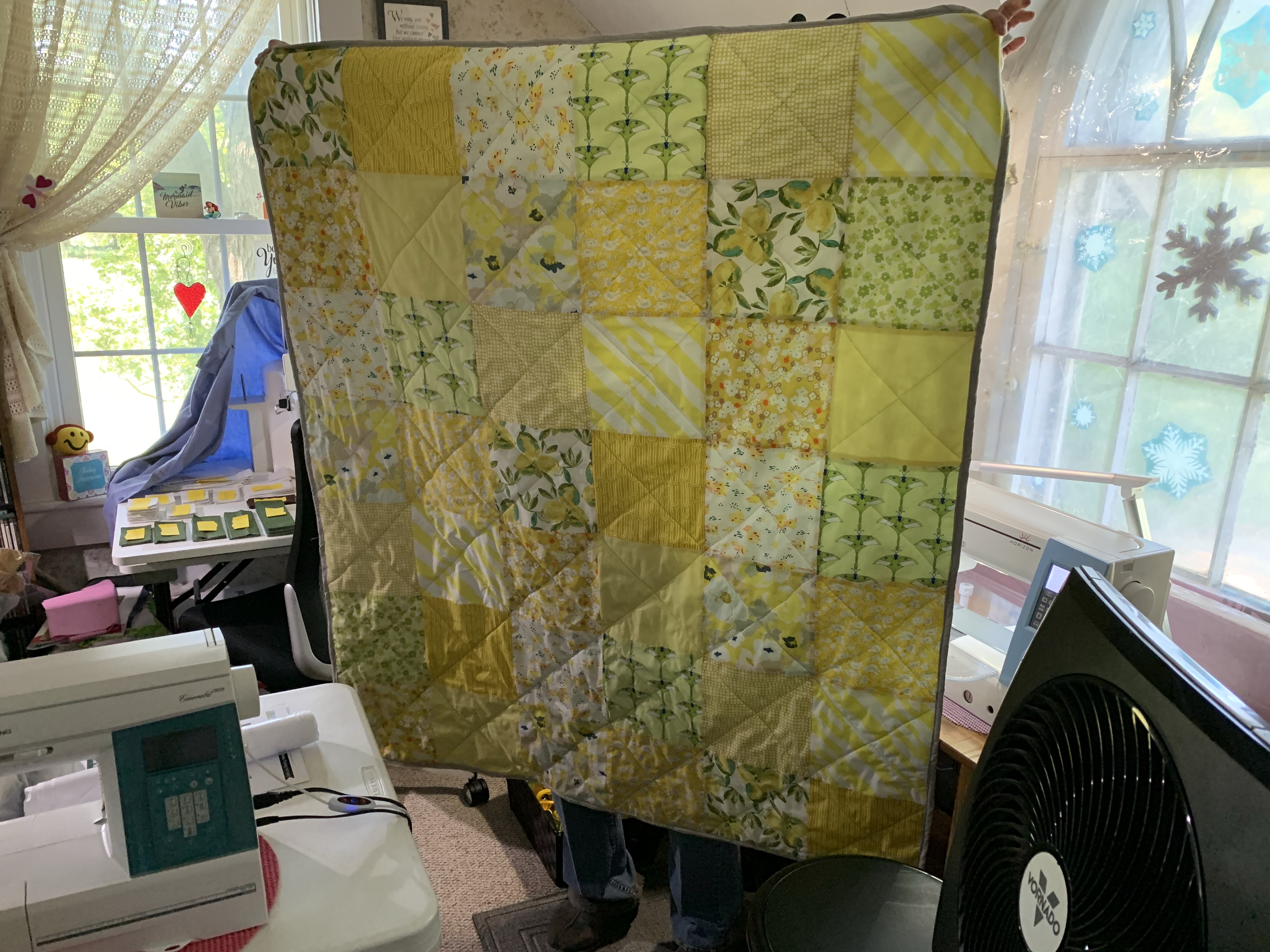 I should’ve taken a close up of the blocks, but there are different bold flower prints, moths (or millers), some stripes, paisleys, and I think a solid here and there. It is so bright and sunshiny!