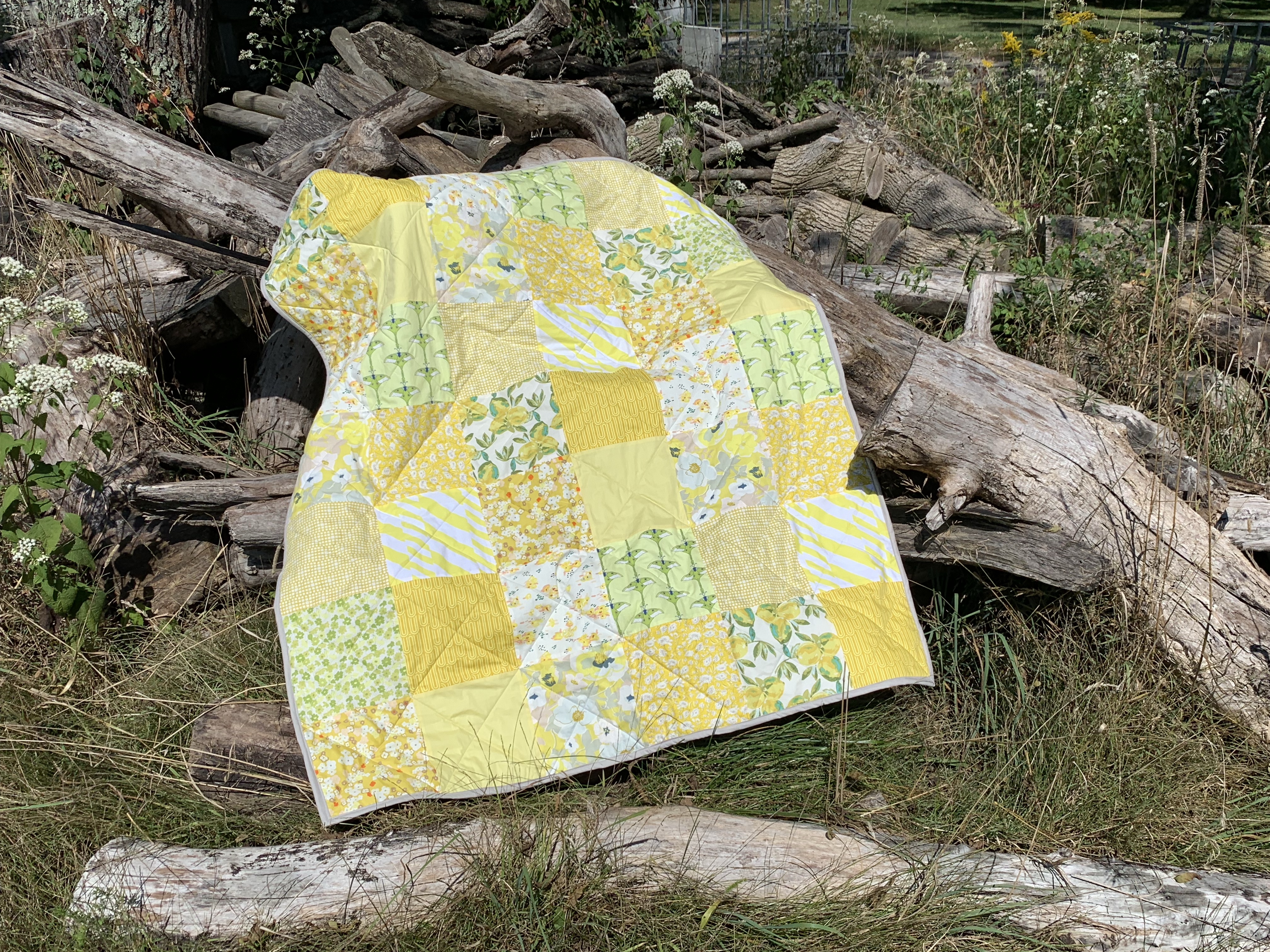 This one is made from a mix of yellow fat quarter prints. Cut into blocks and spread out here and there to make this beautiful sun-shiney quilt.