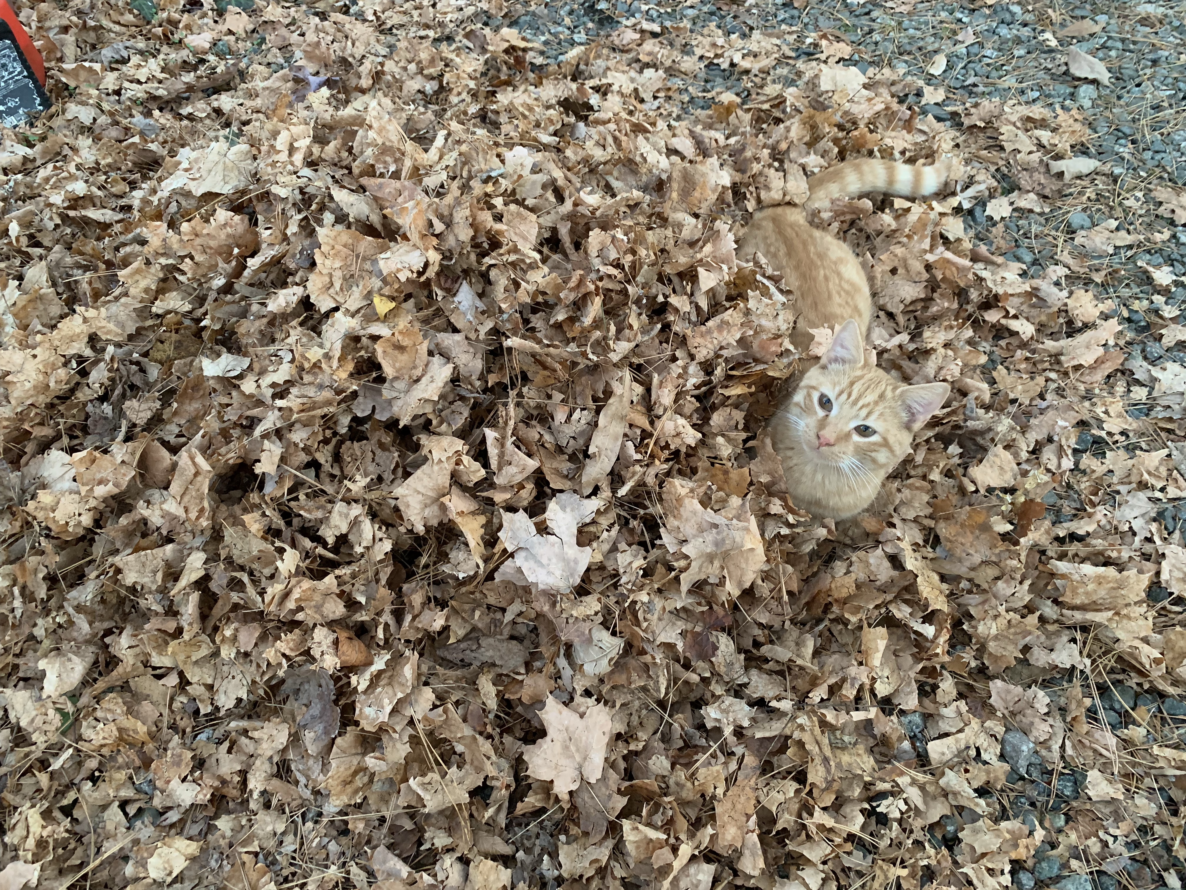 This little guy, Wilder, loved to hide in the leaves and jump out at you. We try to keep the leaves in this little pile, but they always have them spread all over. But when it is in a pile, this is what happens…