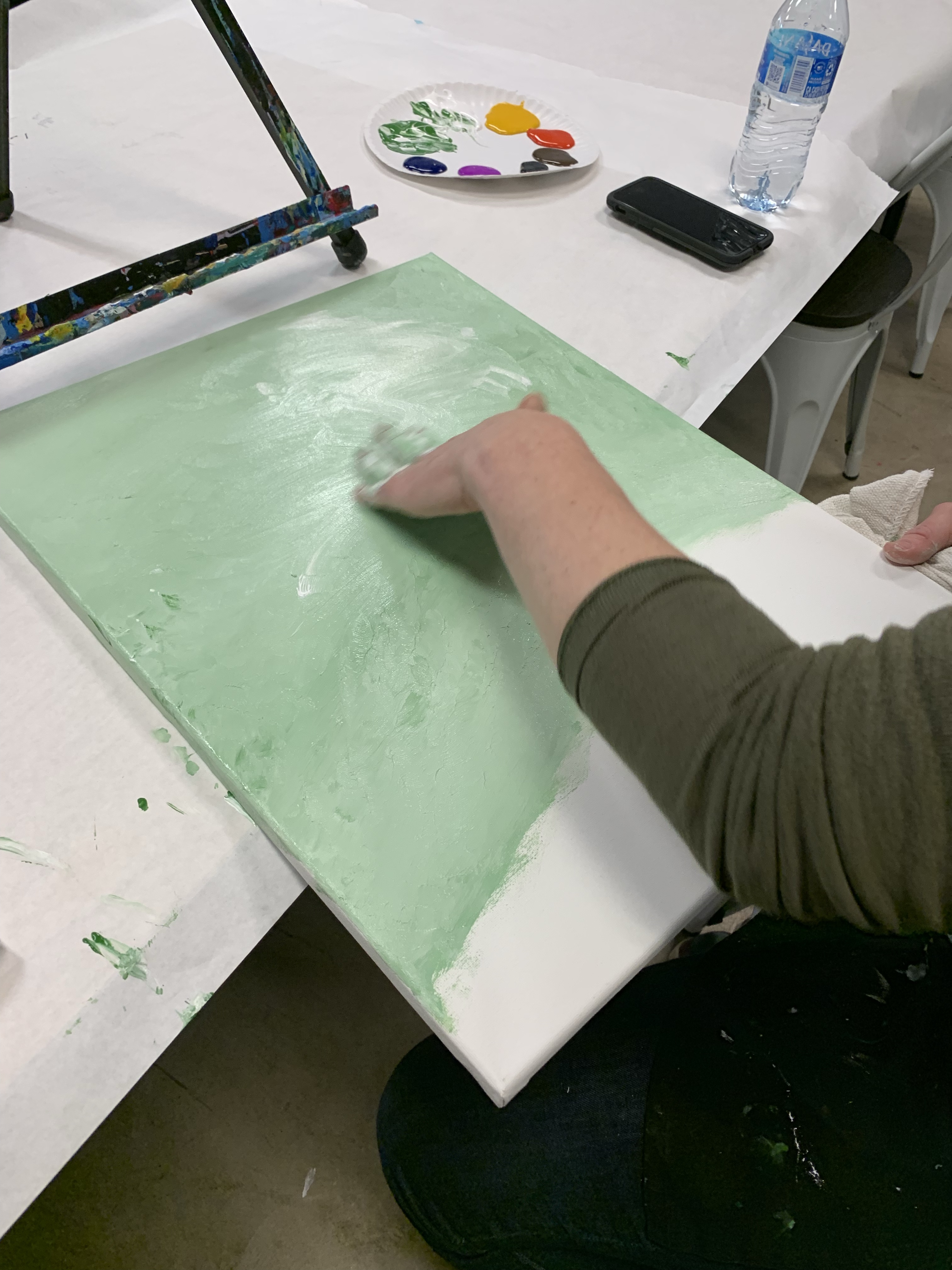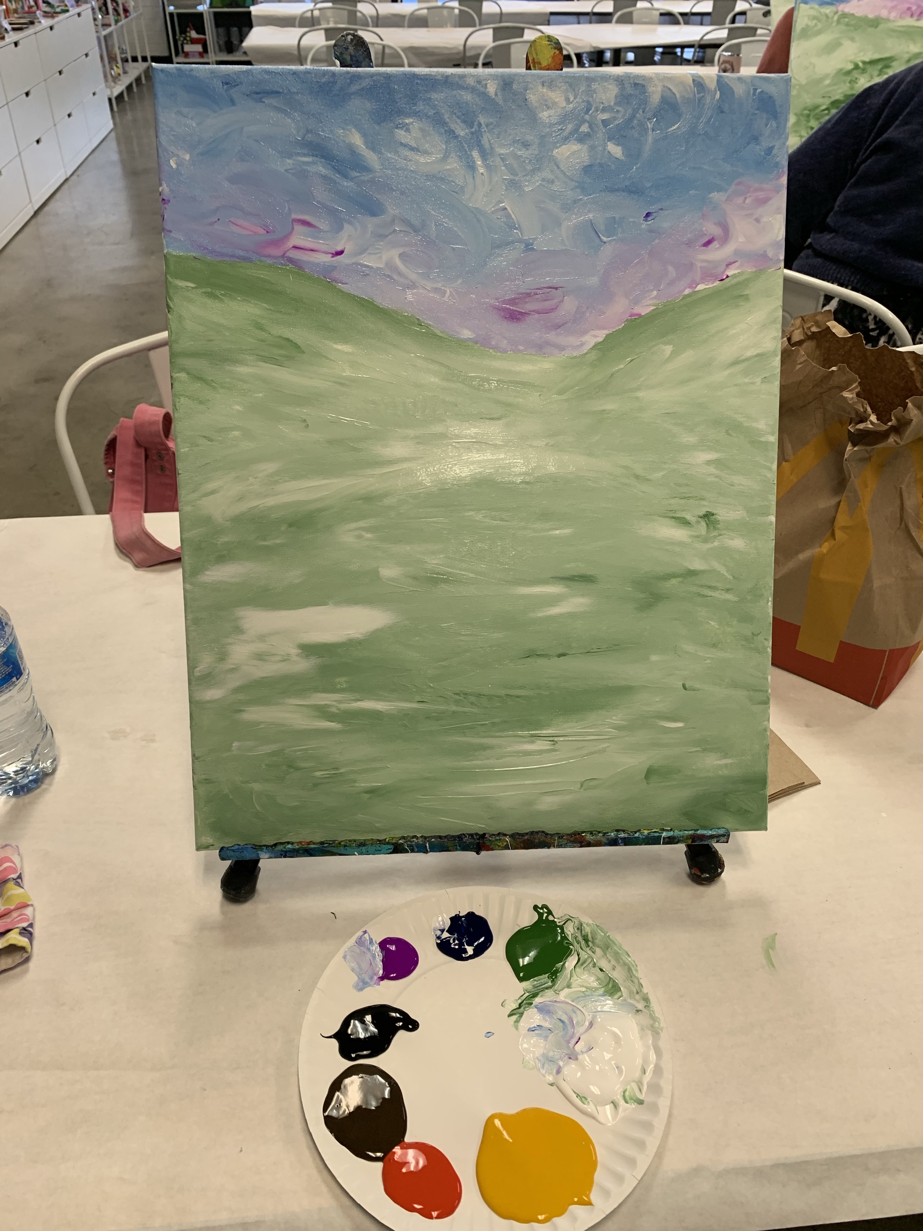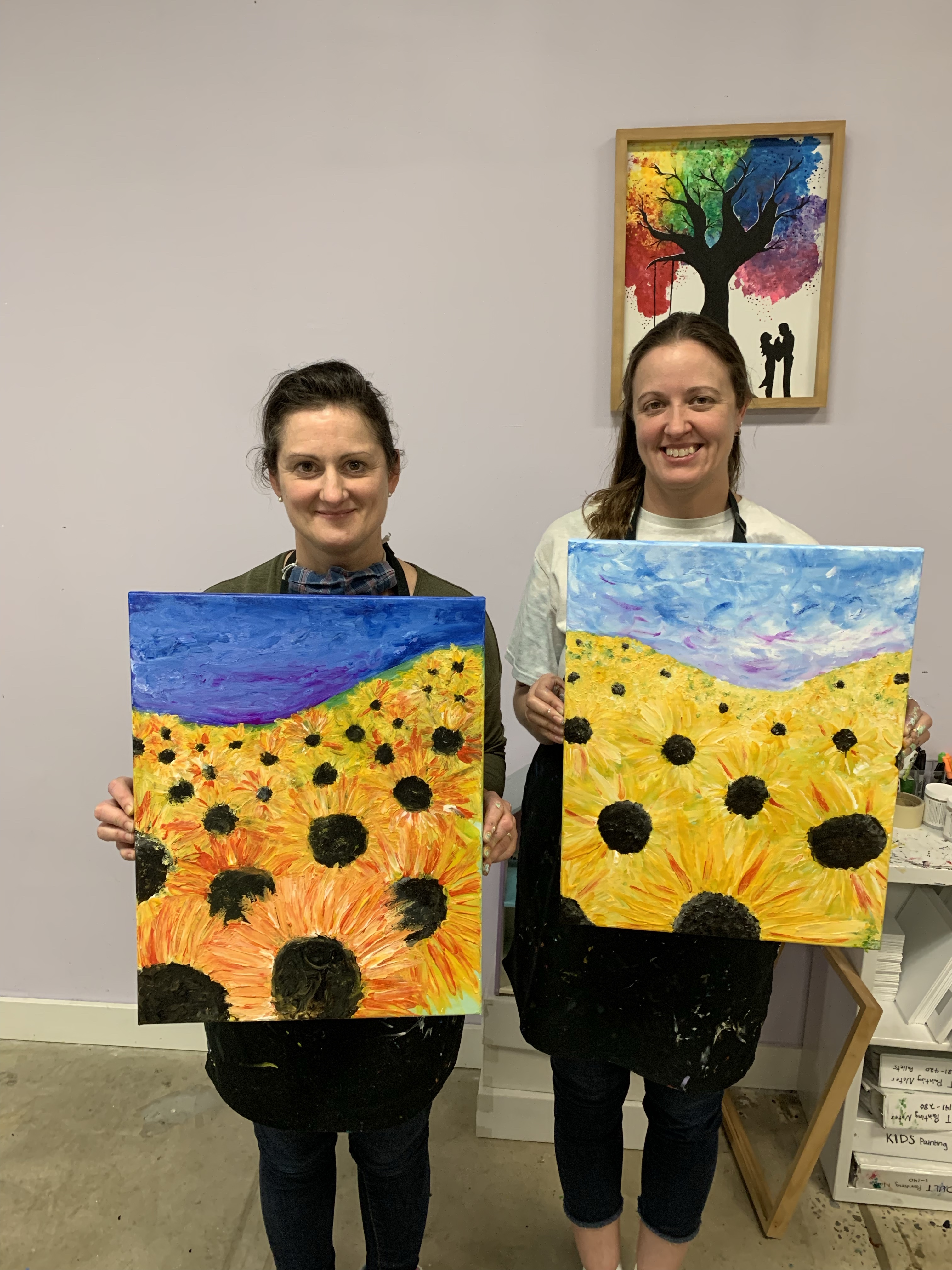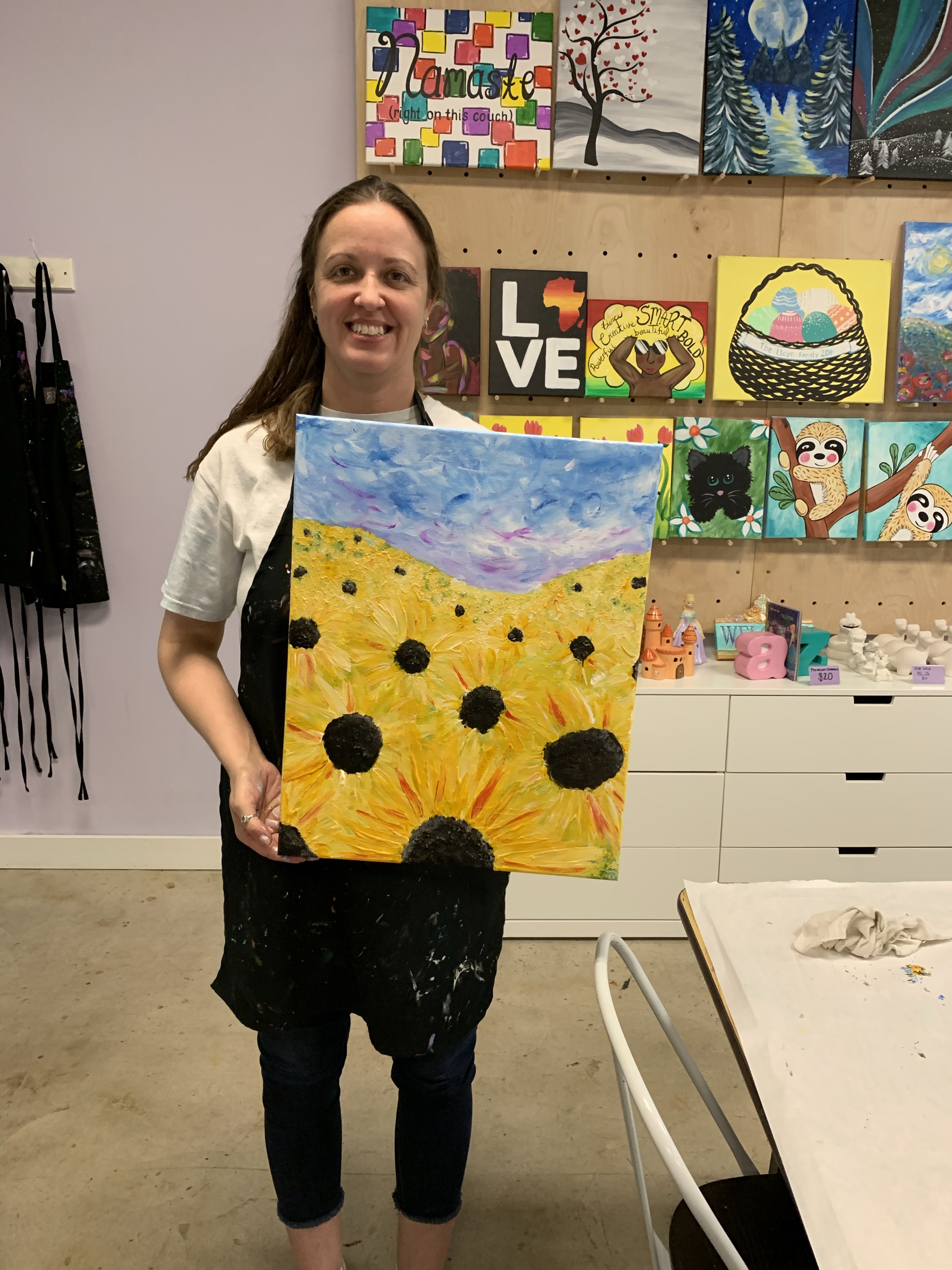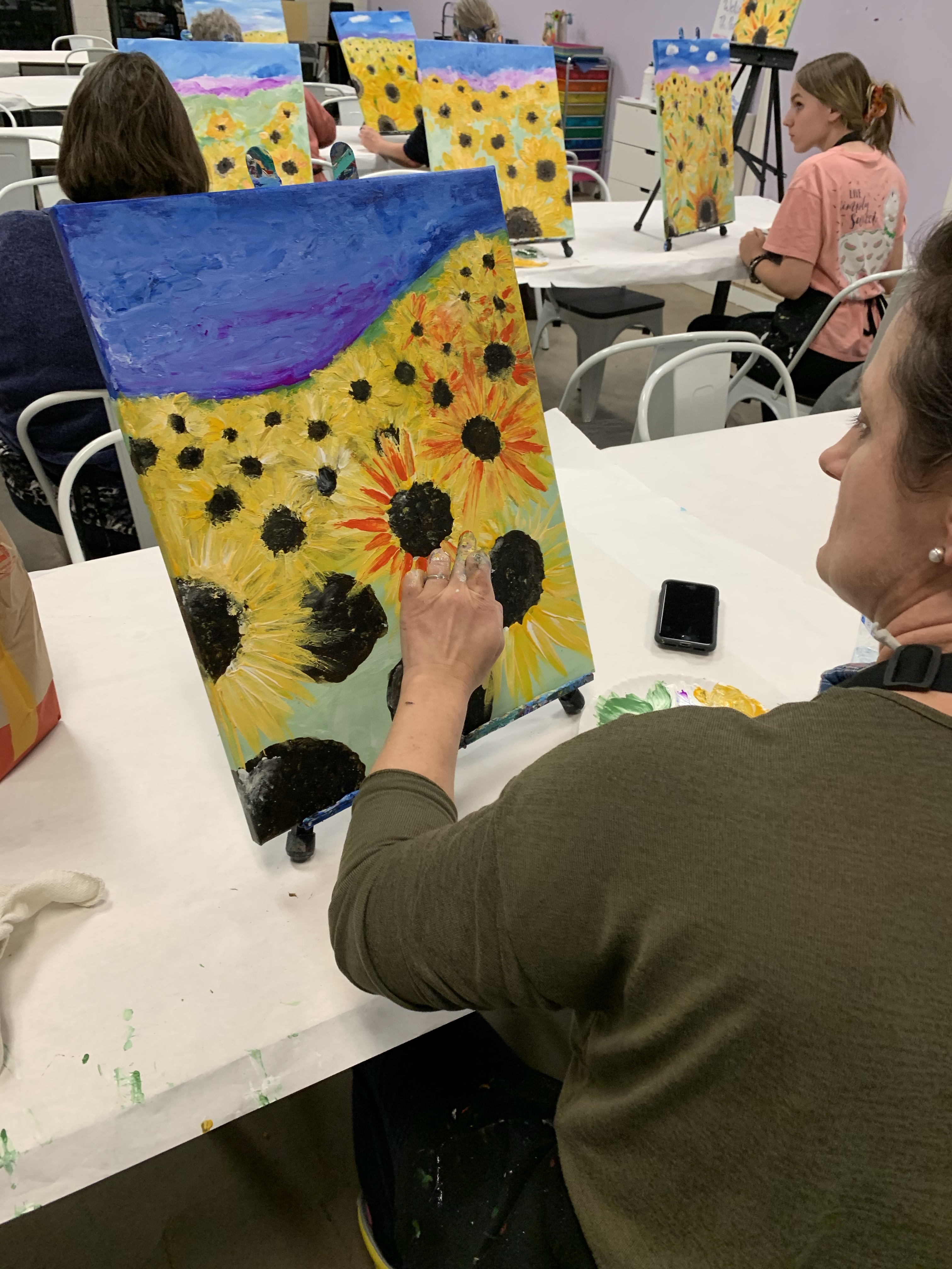 Mary and I chose to finger paint Sunflower Fields at Painted Grape. We had seen other finger paint classes, but none of them really spoke to us–I guess you could say–until we say this class.