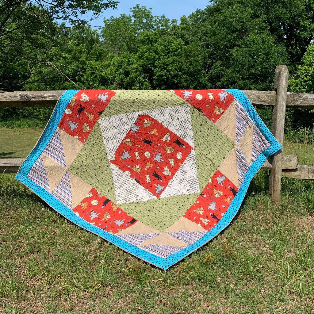 To be honest, I do not remember where I found the fabric or the fabric line even (Yikes!), but I found some fun cat fabric that I thought would be perfect! The blocks and pieces were so much bigger than any other quilt I had made up to that time. The part that took the most time was the cutting. I had to pull out my T square from my design classes back in the day lol!