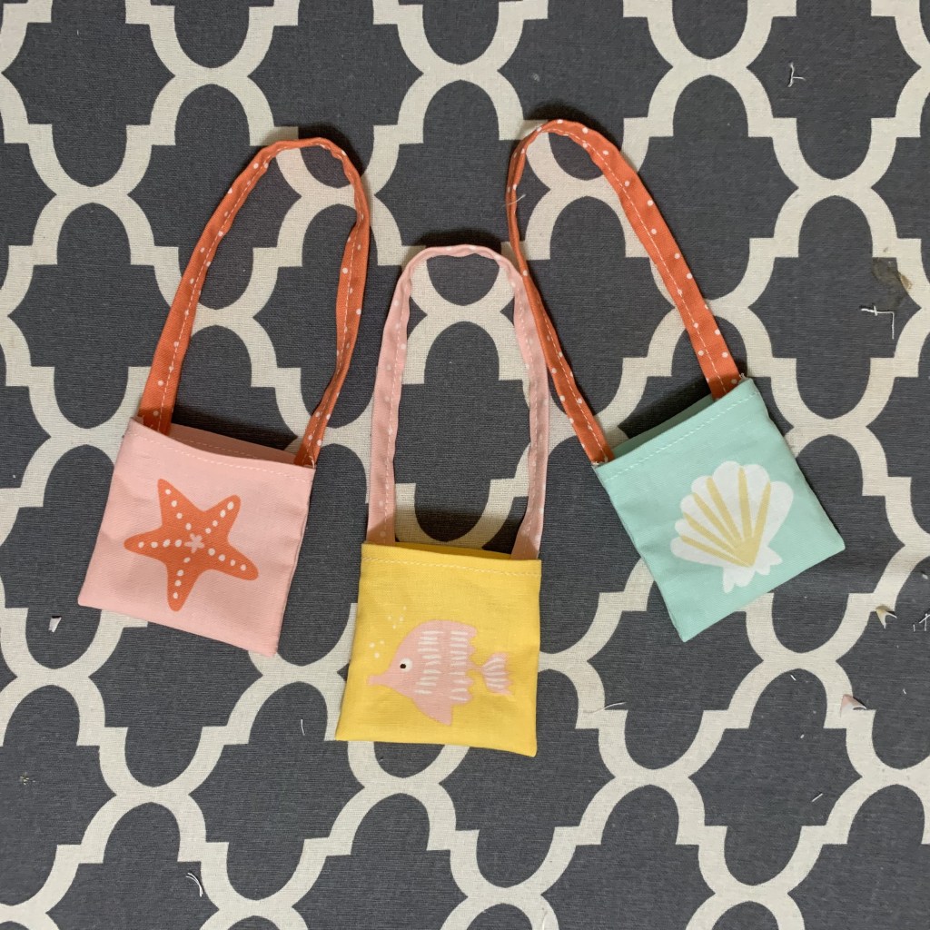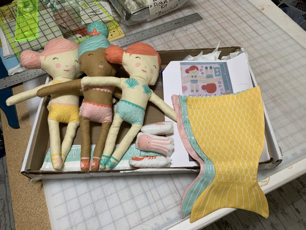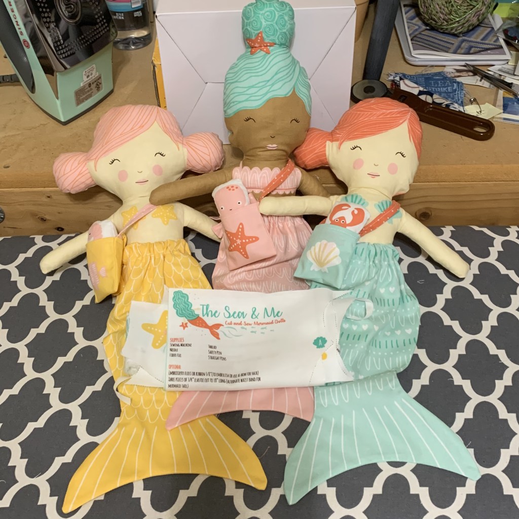 Once all the pieces were complete, I had fun putting on the mermaid tails, tucking the lil friends into the totes, and seeing them all complete and ready to be played with! It reminded me of when I was little playing dolls 🙂