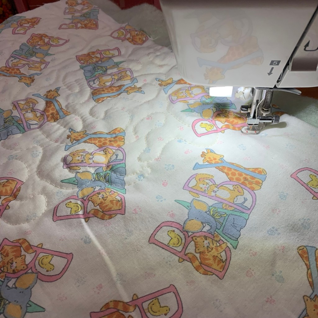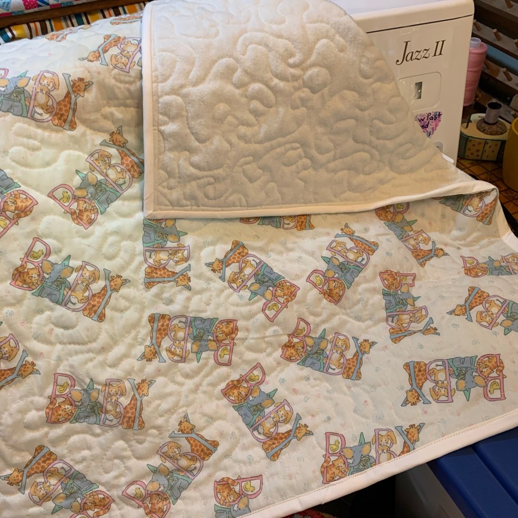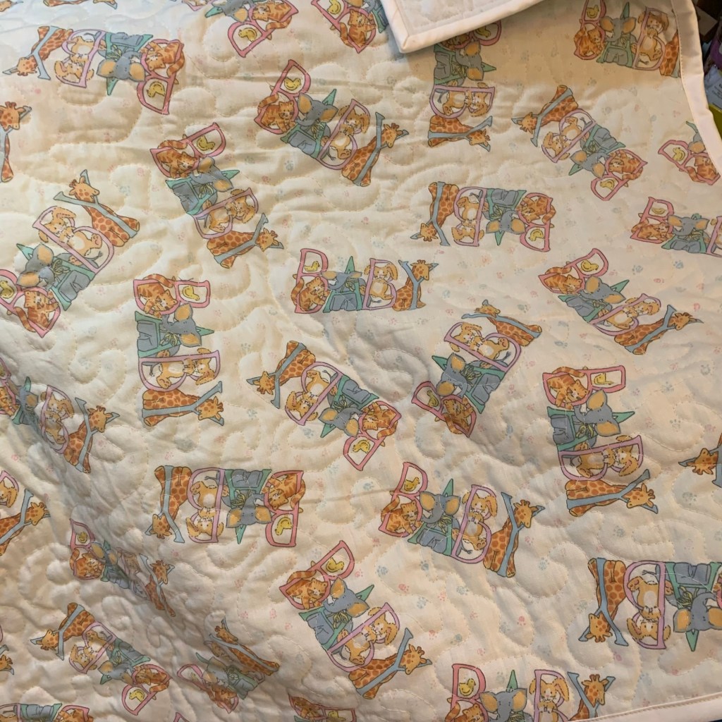 I should have taken a before photo, but didn’t. Mom used the BABY print cotton fabric for the front and a beige flannel for the back. She used batting in the middle, but didn’t tie or quilt it. I didn’t think much about it when I put it in the wash, but when the quilt came out of the dryer, the batting was bunched up in the center.
