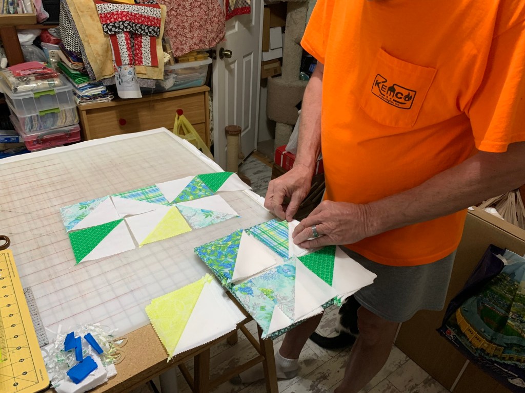 My husband wanted to mess with my blocks so I let him lay some out and choose a jelly roll border. This is his layout: