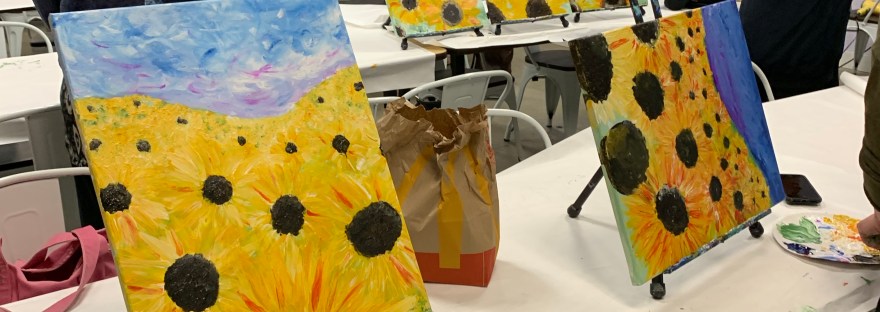 Who says you're ever too old to finger paint? No-one we know because we planned a girls night out to do just that! Mary and I chose to finger paint Sunflower Fields at Painted Grape. We had seen other finger paint classes, but none of them really spoke to us–I guess you could say–until we… Continue reading Finger Painting