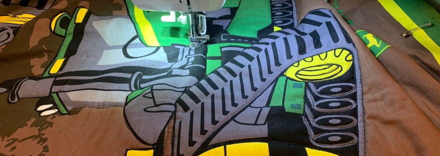 I’ve had this panel for awhile now and finally decided it was time to become a quilt. I sandwiched it using a black Jersey knit backing. It’s like a really soft sweatshirt type of fabric. I was a bit nervous about how it would do being quilted, but the sample piece I tested did just… Continue reading Tractor Factor Finished!